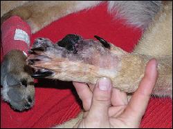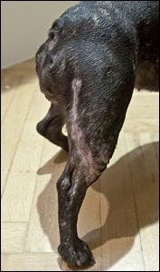 Besonders dramatisch war die Verletzung einer jungen Französischen Bulldoggenhündin, die, obwohl kurz- und glatthaarig, beim Sitzen auf einer Stufe mit der Haut des Unterschenkels in die Rolltreppe hineingezogen wurde. Es dauerte mehr als 30 Minuten, bis das Tier nach Stoppen der Treppe aus dem Gewinde befreit werden konnte. Eine aufwendige operative Wundversorgung und anschließende Verbandswechsel über mehrere Wochen waren notwendig – Gott sei Dank sind nur Narben als kleine Schönheitsmakel zurückgeblieben. |